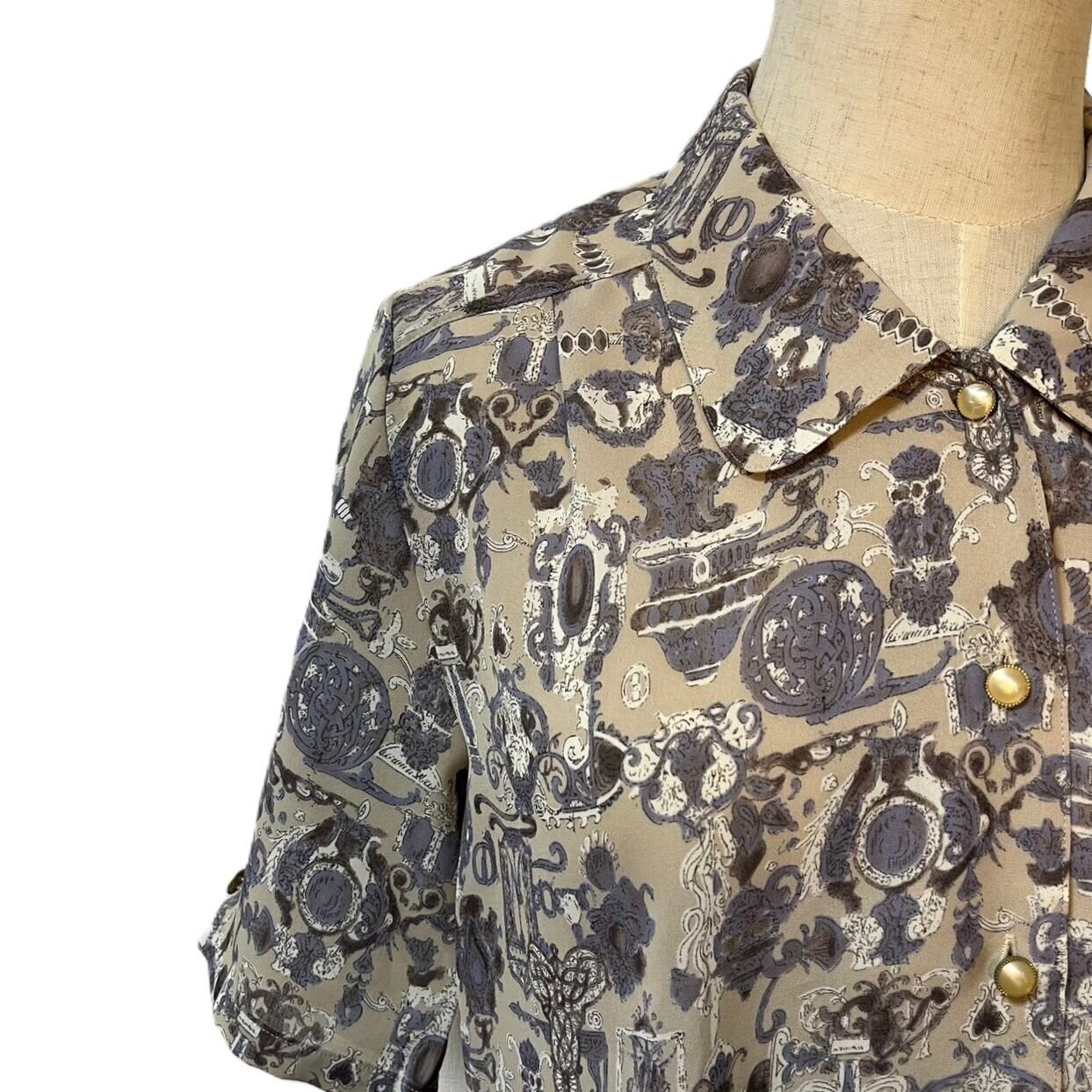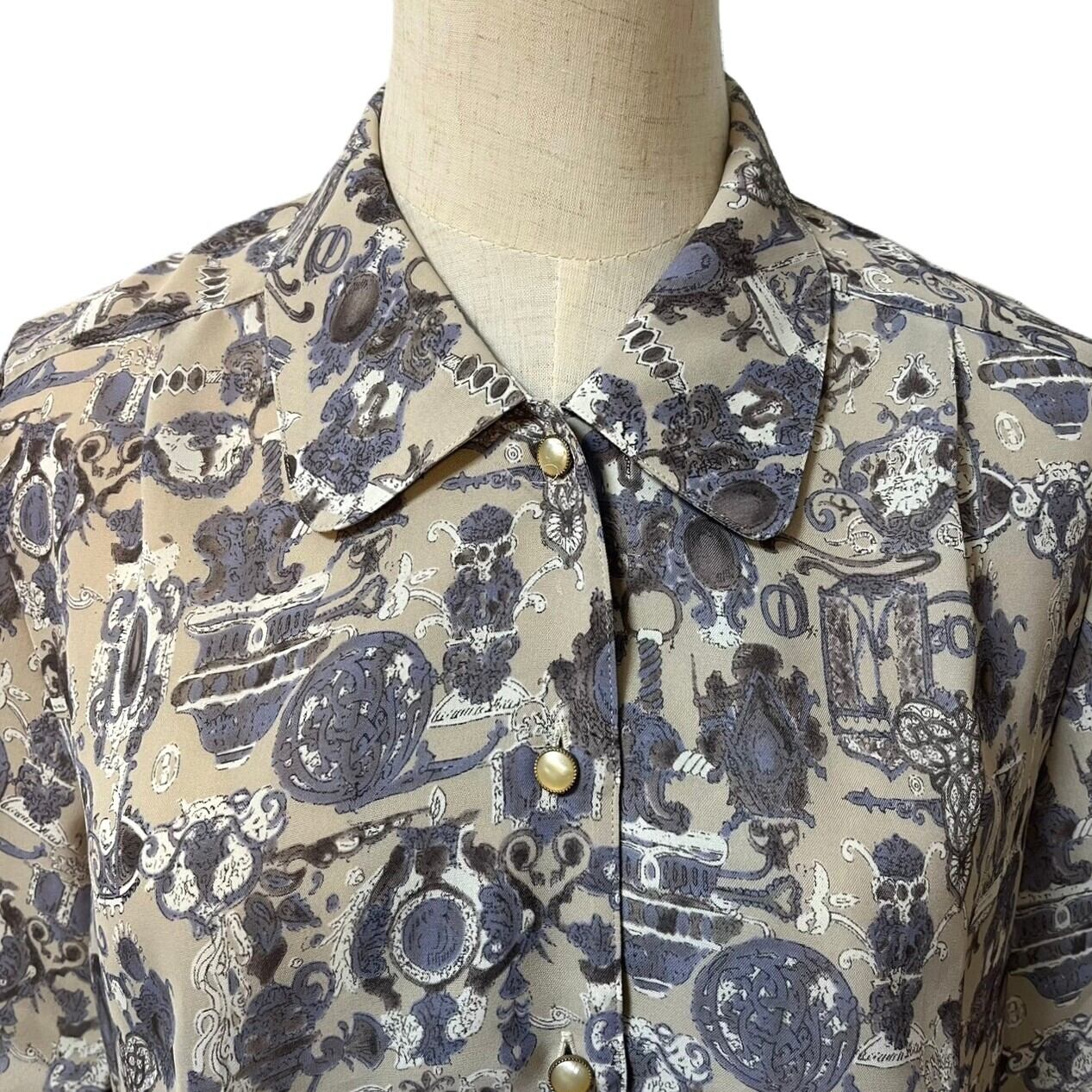 ベージュ色に薄紫色のレトロでクラシカルな総柄があしらわれた半袖ブラウスです!